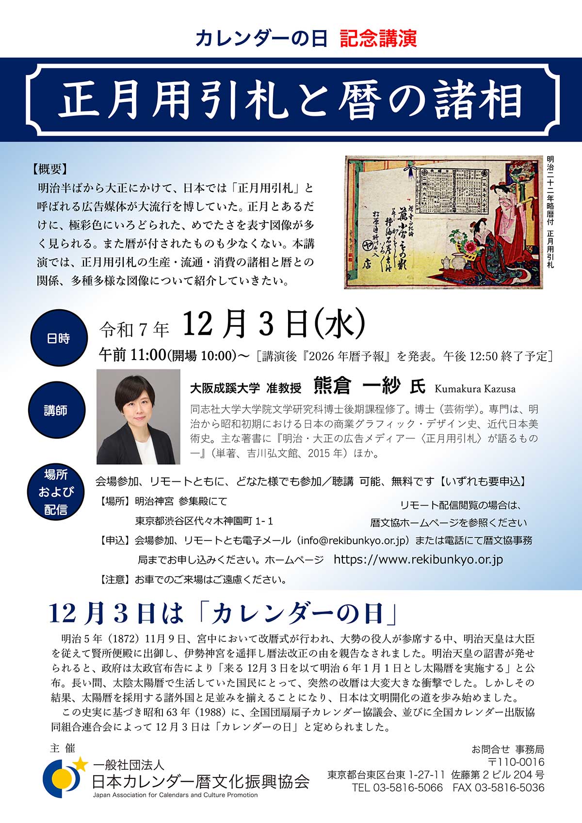 - 記念講演会「正月用引札と暦の諸相」、来年の暦予報